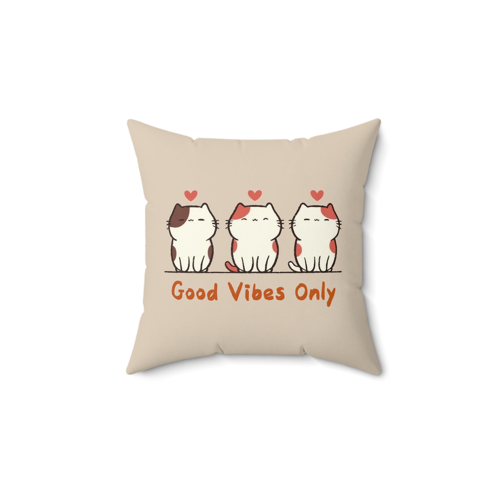 Transform your living space with this charming Spun Polyester Square Pillow, designed to evoke warmth and positivity. Featuring an adorable illustration of three cats and the cheerful phrase "Good Vibes Only," this pillow invites comfort and happiness into your home. Its delightful design effortlessly fits into any cozy nook, making it a perfect addition for cat lovers and those who adore a lighthearted aesthetic. Ideal for brightening up your living room or bedroom, this pillow is a tasteful gift for occasions such as housewarmings, birthdays, or even as a thoughtful gesture just because. Whether you're curling up with a book or decorating for the holidays, this pillow brings a playful and loving vibe that everyone will appreciate.